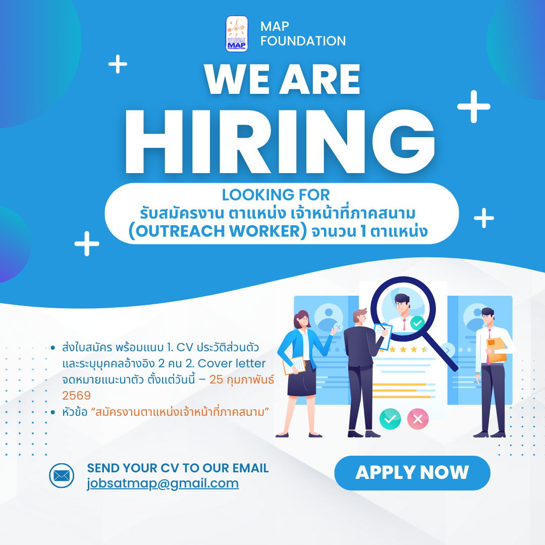 Read more: รับสมัครงาน ตำแหน่ง เจ้าหน้าที่ภาคสนาม (Outreach Worker) จำนวน 1 ตำแหน่ง
