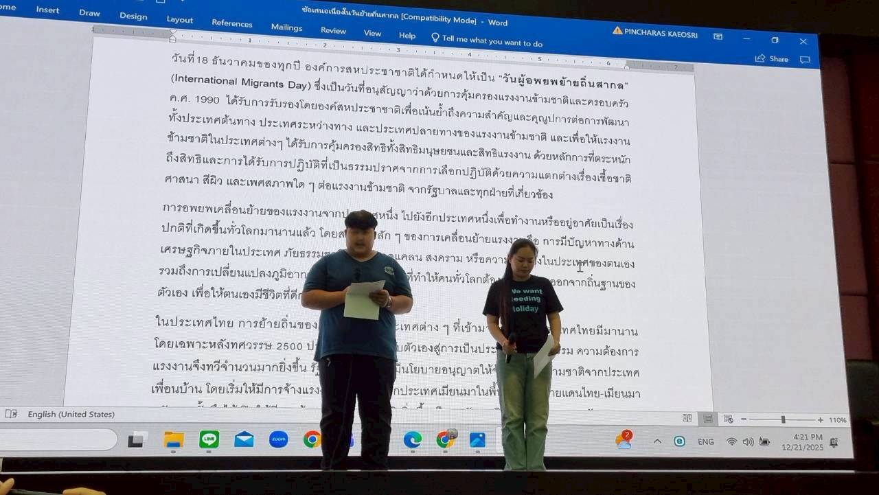 เมื่อวันที่ 21 ธันวาคม 2568 เครือข่ายแรงงานภาคเหนือได้จัด กิจกรรมเนื่องในวันแรงงานข้ามชาติสากล ในธีม "Mixed Migration : คนย้ายถิ่นก็ฅนเท่ากัน เราต้องไม่เลือกปฏิบัติต่อผู้ย้ายถิ่น" ณ ห้องประชุมคณะนิติศาสตร์ มหาวิทยาลัยเชียงใหม่